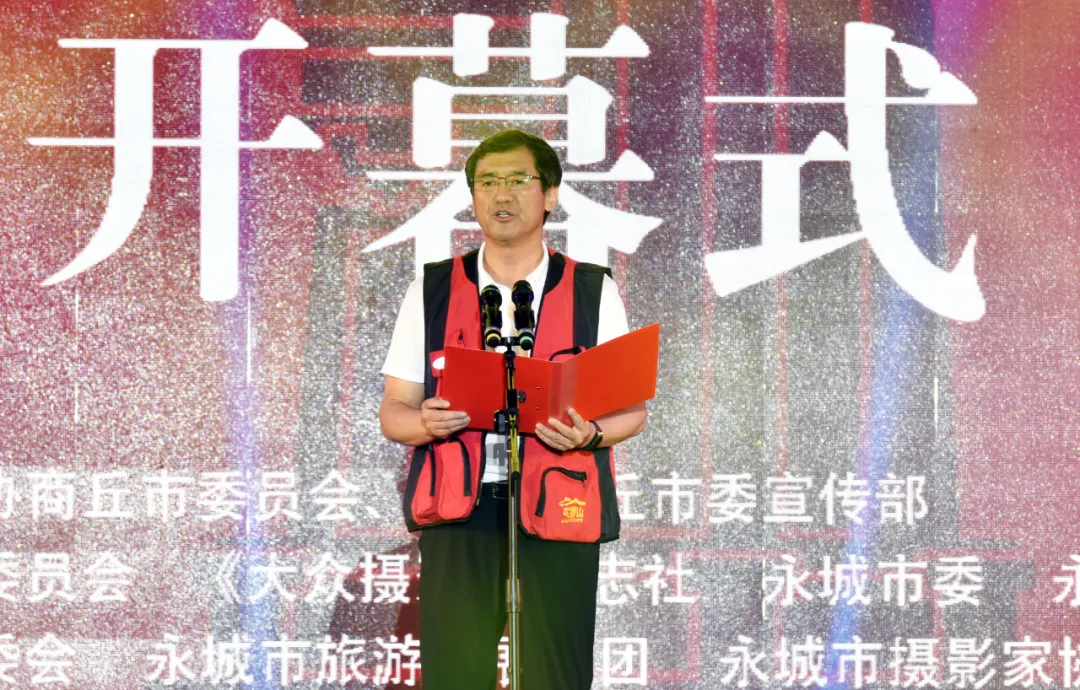 主持人宣读中共永城市委书记李中华、永城市人民政府市长高大立《芒砀山摄影季开幕式欢迎辞》